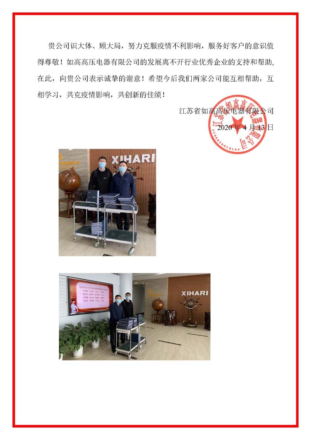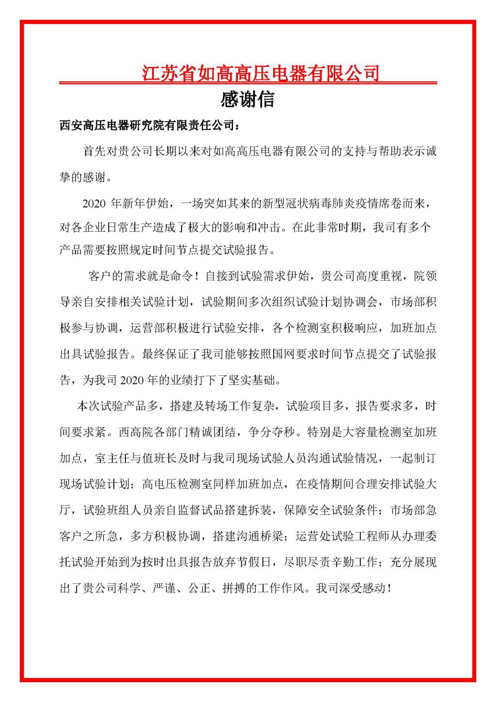 近日,江蘇省如高高壓電器有限公司為我院送來(lái)了感謝信,特別感謝在此非常時(shí)期,我院大容量檢測(cè)室、高電壓檢測(cè)室、市場(chǎng)營(yíng)銷處、運(yùn)營(yíng)處等多個(gè)部門(mén)在其產(chǎn)品委托試驗(yàn)期間熱情周到的服務(wù)。感謝信全文如下: