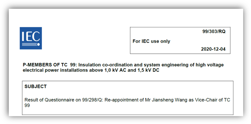 近日,國際IEC發(fā)布了99/303/RQ號文件,文件宣布IEC/TC99技術(shù)委員會全票通過我院王建生博士連任IEC/TC99副主席,此屆任期為2020-11-01至2023-10-31。