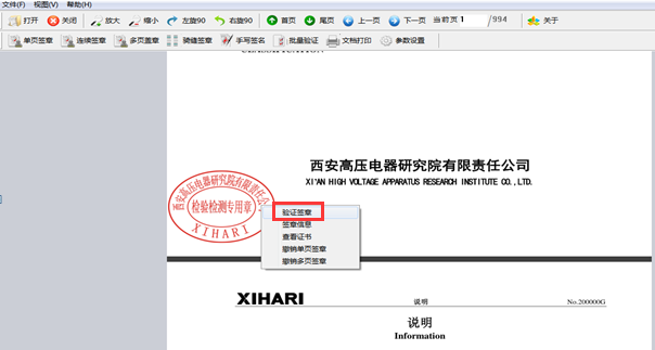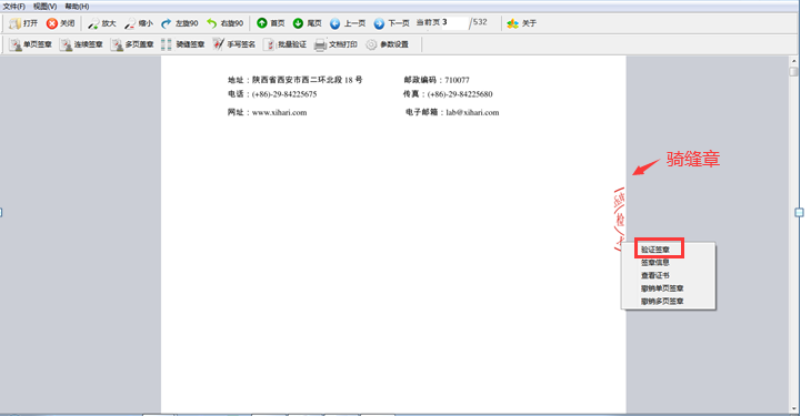 5)光標移動到印章(正文章或騎縫章)上點鼠標右鍵,選擇驗證簽章,如下圖: