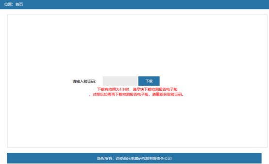 點擊報告下載按鈕,驗證碼將發(fā)送至辦理委托時預留的手機號碼,輸入驗證碼即可下載電子簽章報告: