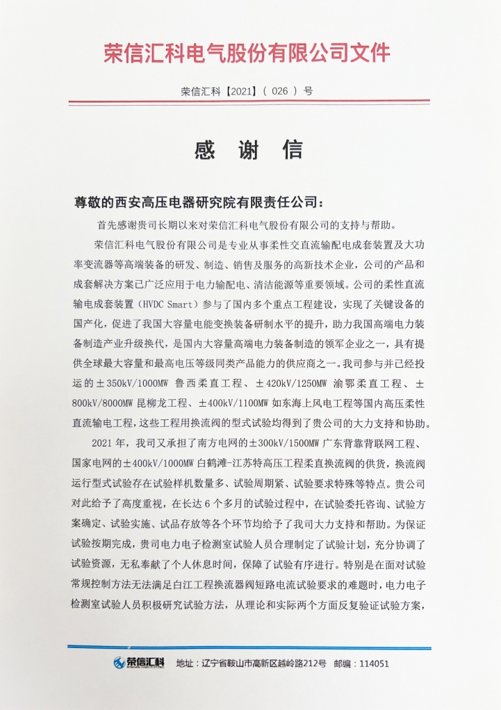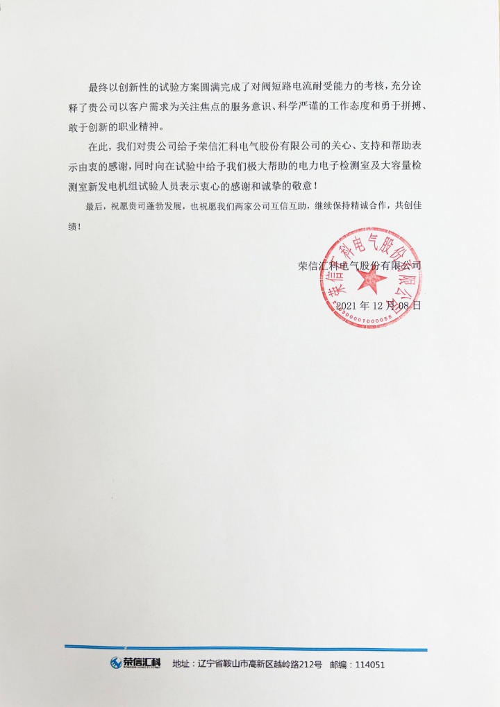 此次運(yùn)行試驗(yàn)得到了客戶的高度肯定,我院收到了來自客戶的感謝信。