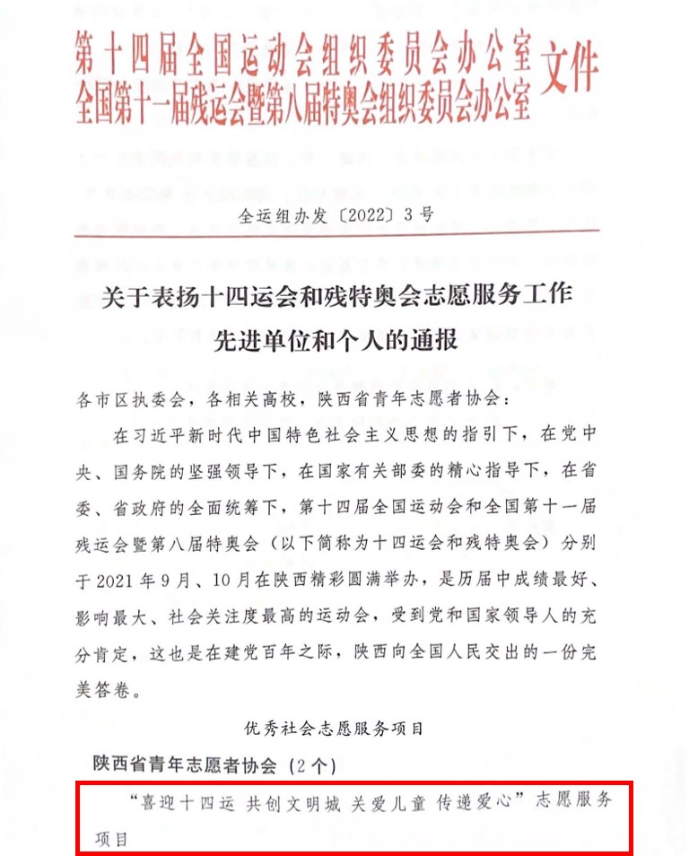 近日,第十四屆全國運動會和全國第十一屆殘運會暨第八屆特奧會(以下簡稱十四運會和殘?zhí)貖W會)組委會對十四運會和殘?zhí)貖W會志愿服務先進單位、志愿服務優(yōu)秀組織單位、優(yōu)秀志愿者、優(yōu)秀社會志愿服務項目予以通報表揚。我院“喜迎十四運 共創(chuàng)文明城 關愛兒童 傳遞愛心”志愿服務項目喜獲優(yōu)秀社會志愿服務項目獎。
