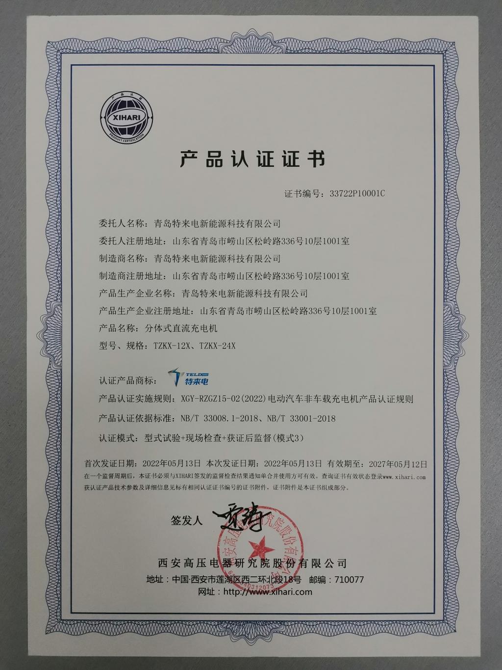 近日,西高院認(rèn)證機(jī)構(gòu)為青島特來電新能源科技有限公司頒發(fā)了首張分體式直流充電機(jī)產(chǎn)品認(rèn)證證書,標(biāo)志著西高院認(rèn)證業(yè)務(wù)已擴(kuò)展至電動(dòng)汽車充電設(shè)施領(lǐng)域。