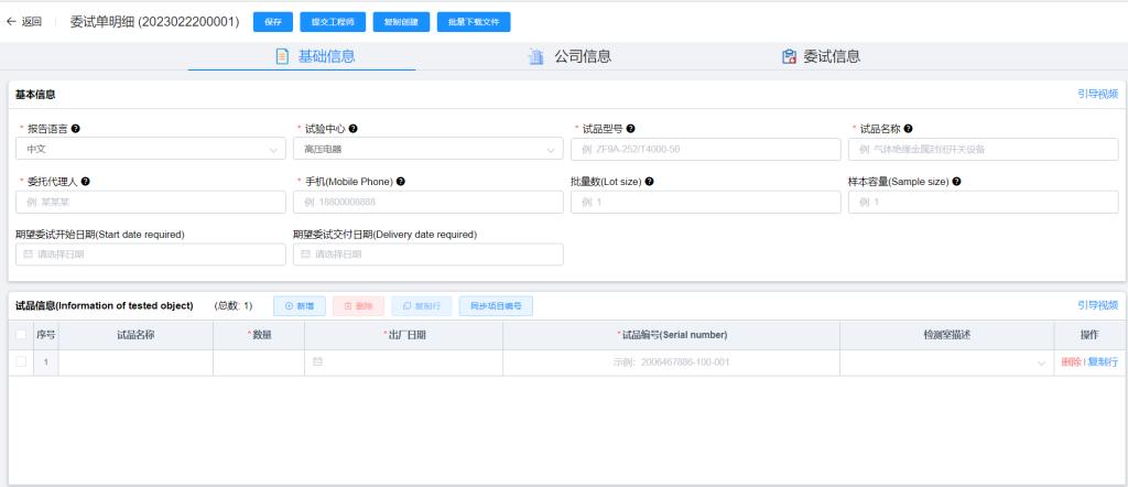 填寫相關信息頁面的基本信息欄,公司信息以及委試信息