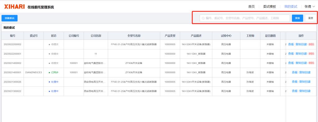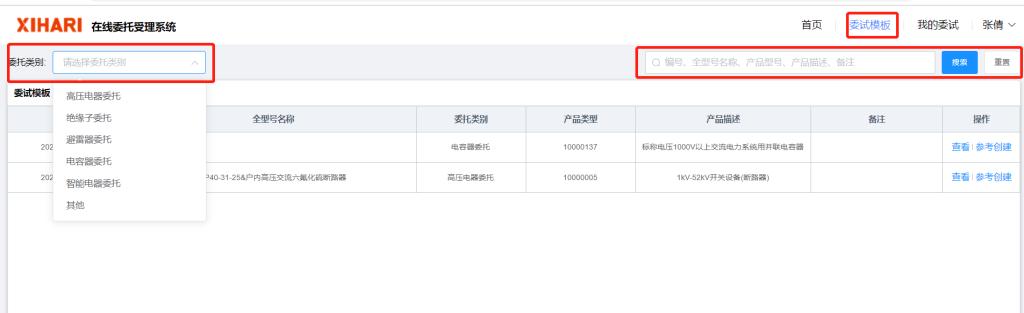步驟2、進入模板委試頁面,可以根據(jù)委試單的編號、委試單號等信息進行查詢
