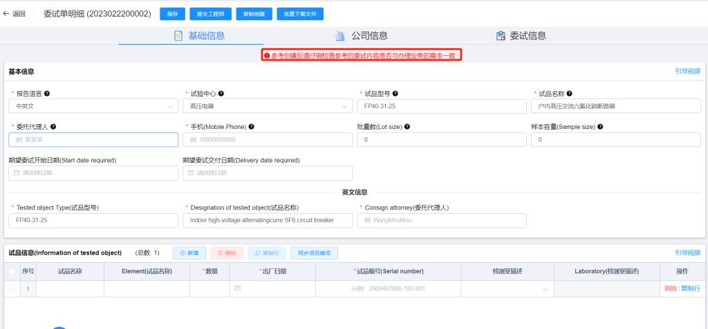 點擊確認按鈕進入委試單明細頁面,參考創(chuàng)建的委試單,會提示‘參考創(chuàng)建后請仔細檢查參考的委試內(nèi)容是否與辦理業(yè)務的需求一致’