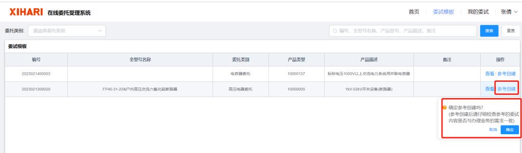 點擊選擇的委試單模板的【參考創(chuàng)建】按鈕,點擊委試模板的確認彈框的【確認】按鈕