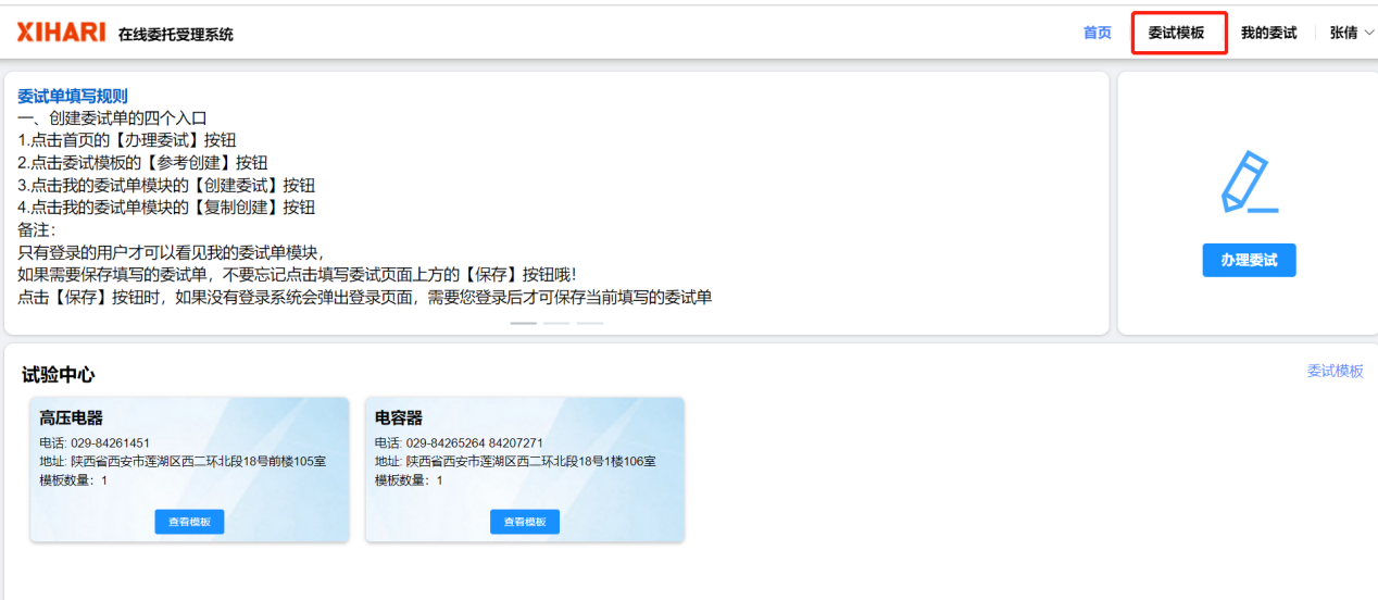 點擊首頁的【模板委試】按鈕,進入模板委試頁面