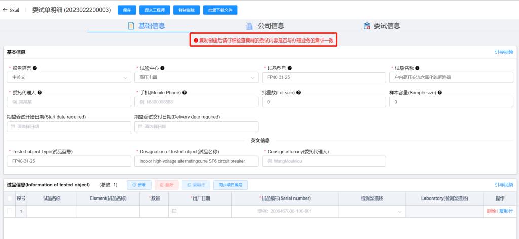 步驟4、點擊確認按鈕進入委試單明細頁面,復制創(chuàng)建的委試單,會提示‘復制創(chuàng)建后請仔細檢查復制的委試內(nèi)容是否與辦理業(yè)務的需求一致’