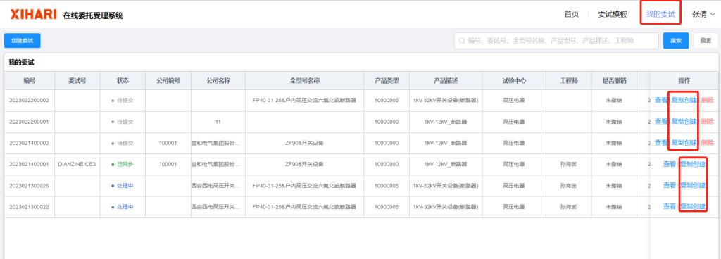該方案適用于在外網(wǎng)委托辦理過委試的用戶,可以針對自己創(chuàng)建的委試單進行復制創(chuàng)建;復制創(chuàng)建會將復制的委試單的基本信息、公司信息,技術(shù)參數(shù),元件,試驗帶到當前的委試單,用需要在此基礎上作修改即可