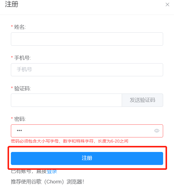 3. 進入注冊頁面,輸入姓名,手機號,點擊發(fā)送驗證碼,輸入手機接收到的驗證碼,輸入設置的密碼