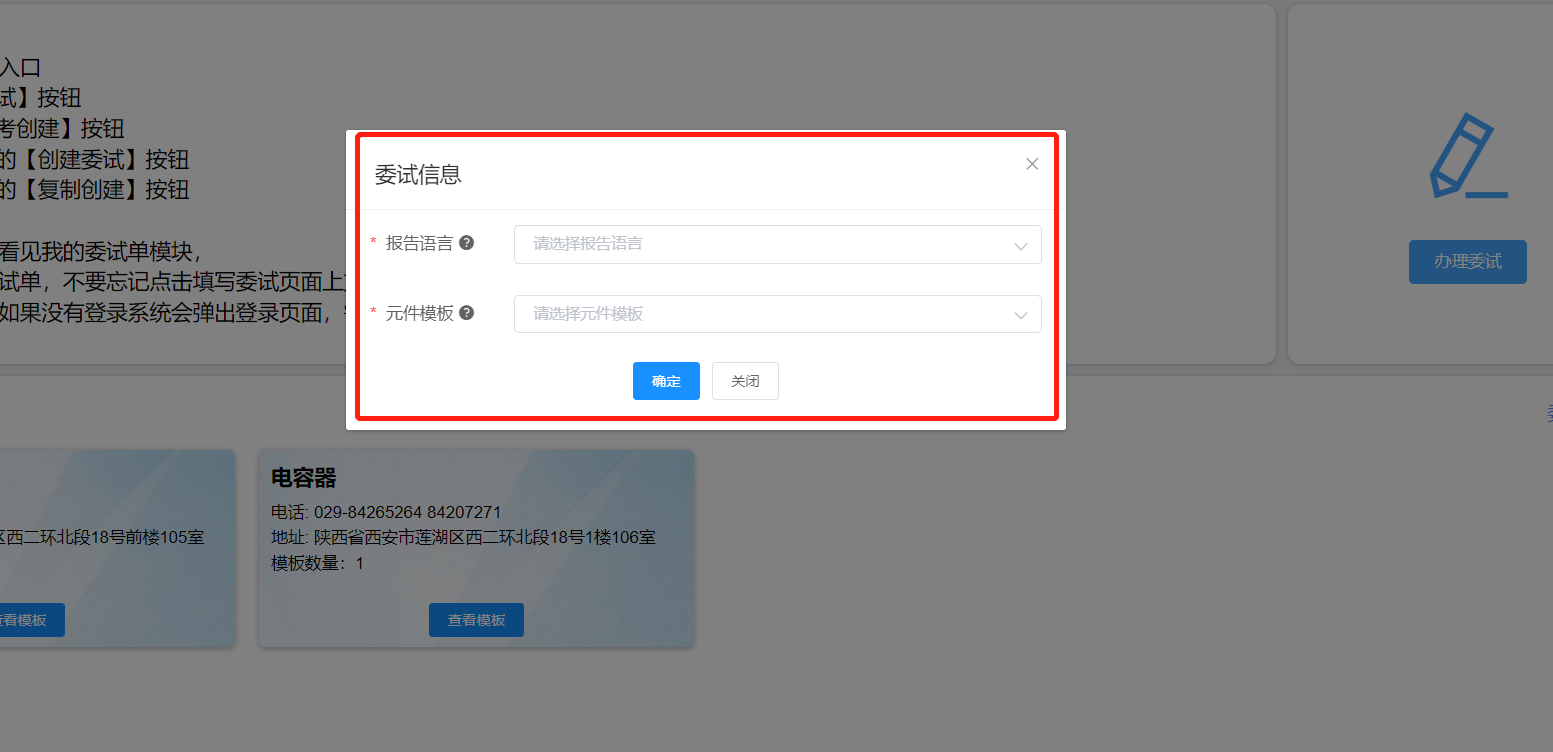 頁面彈出委試信息彈框,選擇報告語言,以及元件模板,填寫完成之后點擊【確定】按鈕
