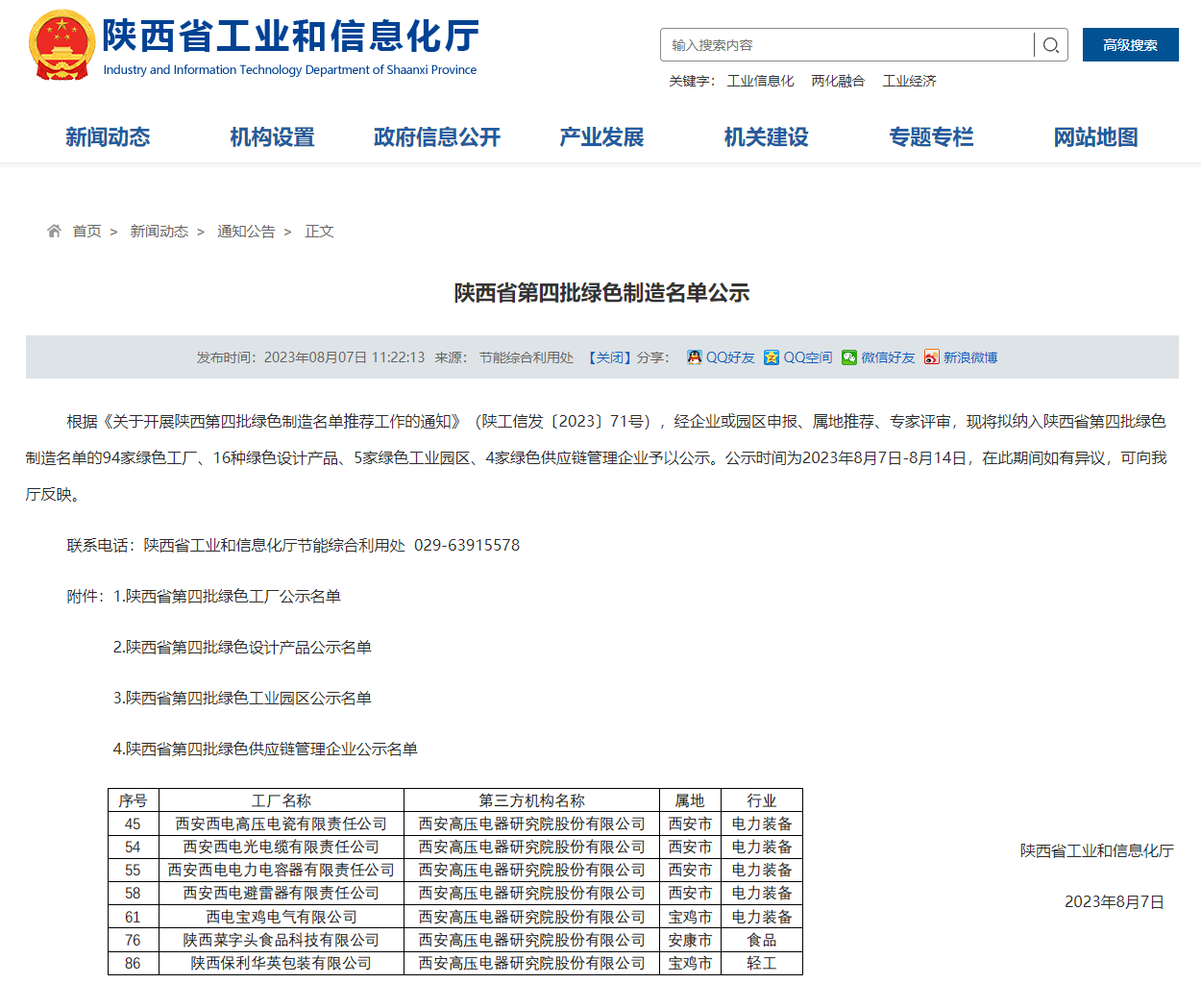 近日,陜西省工業(yè)和信息化廳公示了陜西省第四批綠色制造名單,其中由西高院輔導(dǎo)的西安西電高壓電瓷有限責(zé)任公司、西安西電光電纜有限責(zé)任公司、西安西電電力電容器有限責(zé)任公司、西安西電避雷器有限責(zé)任公司、西電寶雞電氣有限公司、陜西菜字頭食品科技有限公司、陜西保利華英包裝有限公司等7家企業(yè)全部通過省級(jí)綠色工廠評選,通過率100%。