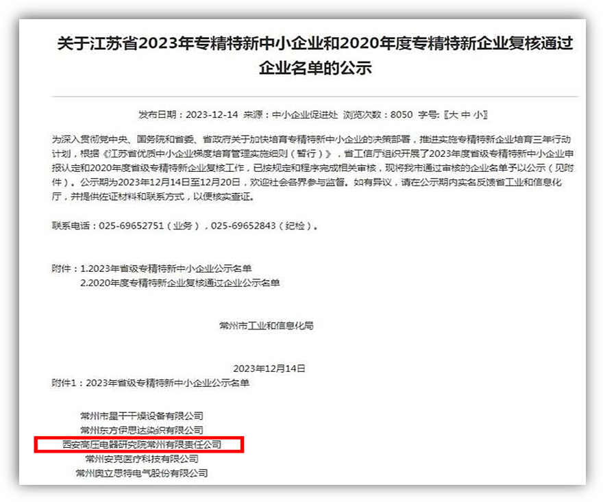 2023年12月14日,常州市工業(yè)和信息化局發(fā)布《關(guān)于江蘇省2023年專精特新中小企業(yè)和2020年度專精特新企業(yè)復(fù)核通過企業(yè)名單的公示》,西高院常州公司成功入選2023年江蘇省省級(jí)專精特新中小企業(yè)名單。