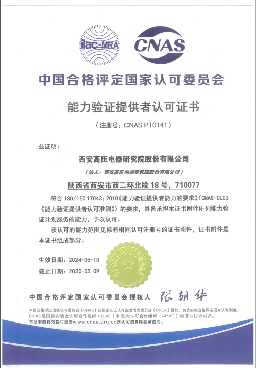 近日,西安高壓電器研究院股份有限公司成功獲得符合ISO/IEC 17043(CNAS-CL03)的能力驗證提供者的CNAS認可資質(注冊號:CNAS PT0141)。該資質是一項國際互認的重要認證,旨在為檢驗檢測機構提供技術能力評價服務。我院可提供的能力驗證范圍包括回路電阻、工頻電壓試驗能力驗證共計2個項目/參數。