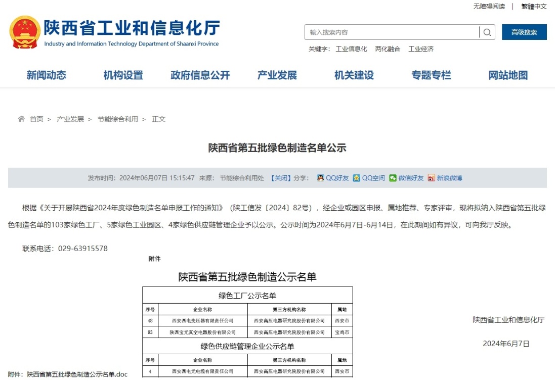 6月7日,陜西省工業(yè)和信息化廳公示了第五批綠色制造名單,其中西高院推薦的西安西電光電纜有限責任公司獲省級綠色供應(yīng)鏈管理企業(yè),實現(xiàn)綠色供應(yīng)鏈成功案例零突破;推薦的西安西電變壓器有限責任公司和陜西寶光真空電器股份有限公司獲省級綠色工廠。