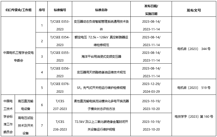 西高院作為中國電機工程學會變電專業(yè)委員會、中國電工技術學會標準工作委員會高壓直流輸電設備、高電壓試驗技術及開關設備、大容量/短路試驗技術、電力電容器及電工陶瓷等工作組的秘書處掛靠單位,2023年西高院積極發(fā)揮行業(yè)平臺作用,在主任委員和秘書長的組織協(xié)調下,由西高院歸口管理的7項團體標準發(fā)布實施,具體信息如下: