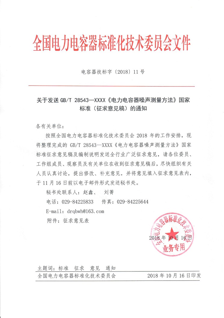 電容器技標(biāo)字(2018)11號(hào)——關(guān)于發(fā)送GBT28543國(guó)家標(biāo)準(zhǔn)征求意見(jiàn)稿的通知