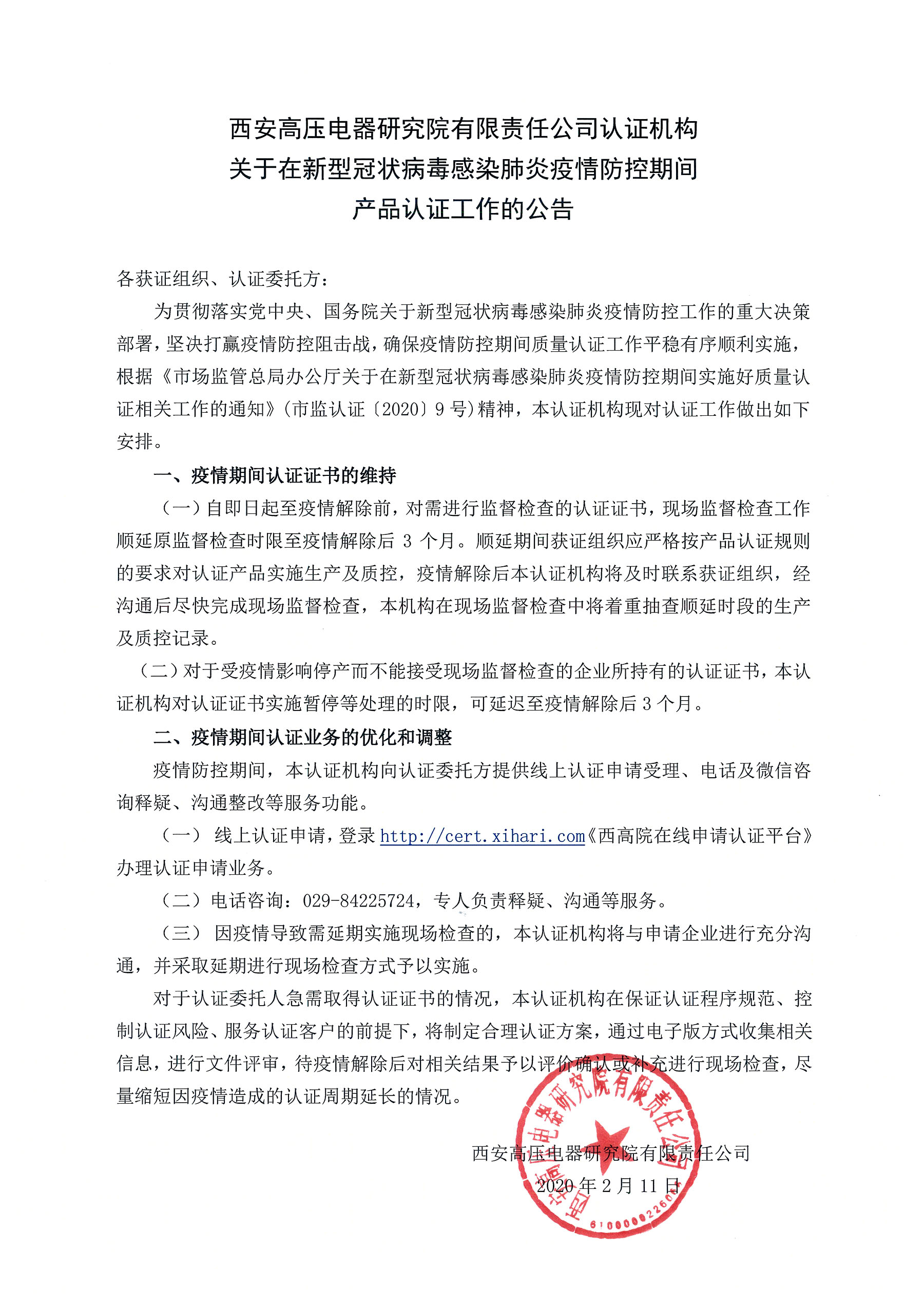 西安高壓電器研究院有限責(zé)任公司認(rèn)證機(jī)構(gòu)關(guān)于在新型冠狀病毒感染肺炎疫情防控期間產(chǎn)品認(rèn)證工作的公告